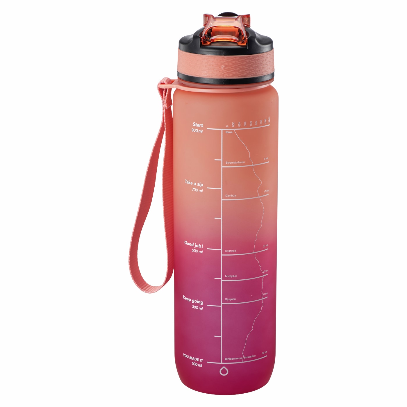 Motivasjons drikkeflaske som har løpeprofilen til Birken, merket med de ulike stasjonene over fjellet. Denne flasken gir deg motivasjon til å drikke nok, og til riktig tid, enten du går over fjellet på ski eller sykler.