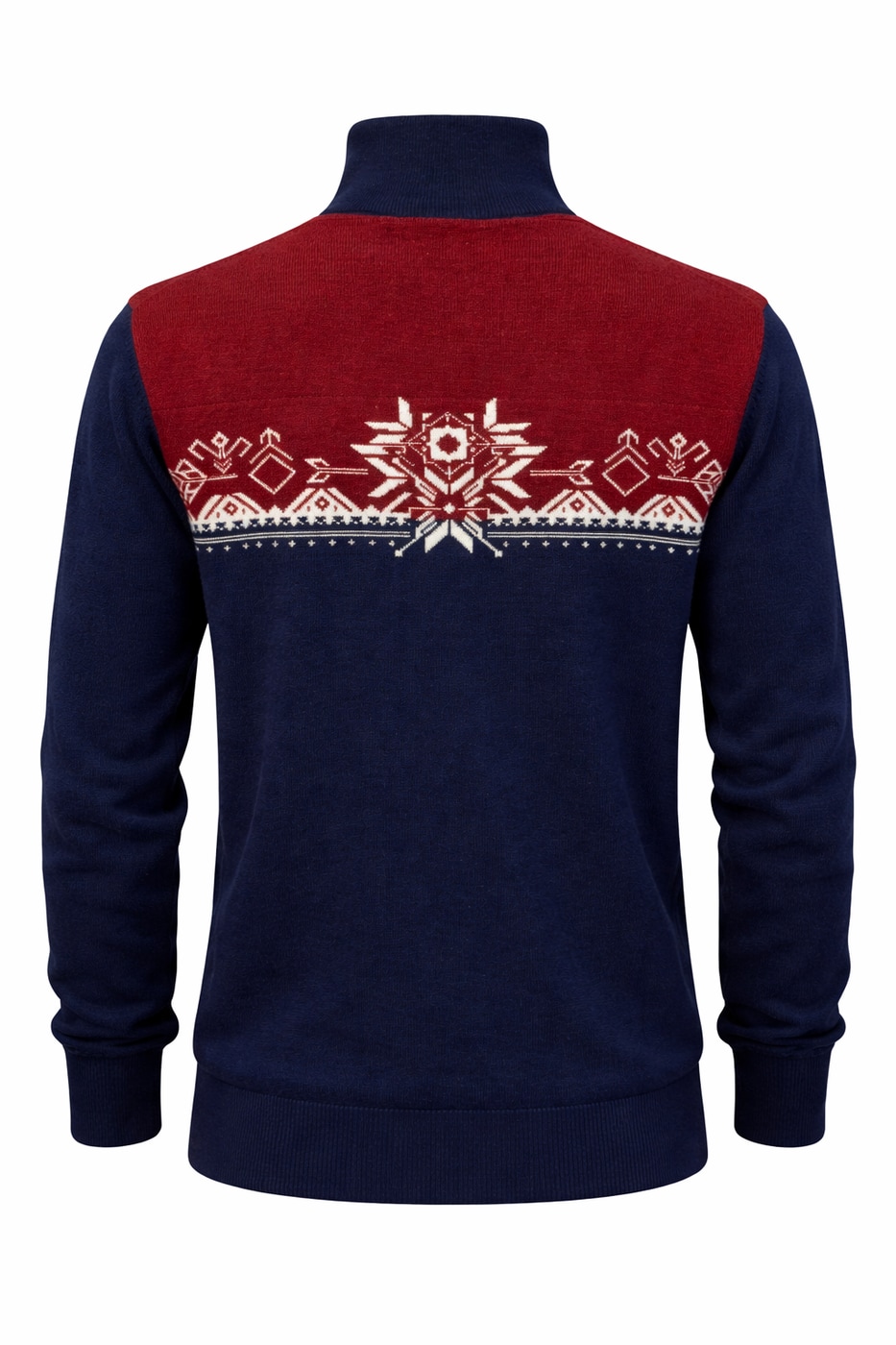 Det karakteristiske snøkrystallmønsteret over bryst og rygg gir genseren et autentisk, skandinavisk uttrykk, mens kontrasten mellom dyp Birkens marineblå og varm burgunder skaper et elegant og sporty preg. Den høye kragen med glidelås gir ekstra komfort og gjør det enkelt å regulere temperaturen gjennom dagen.